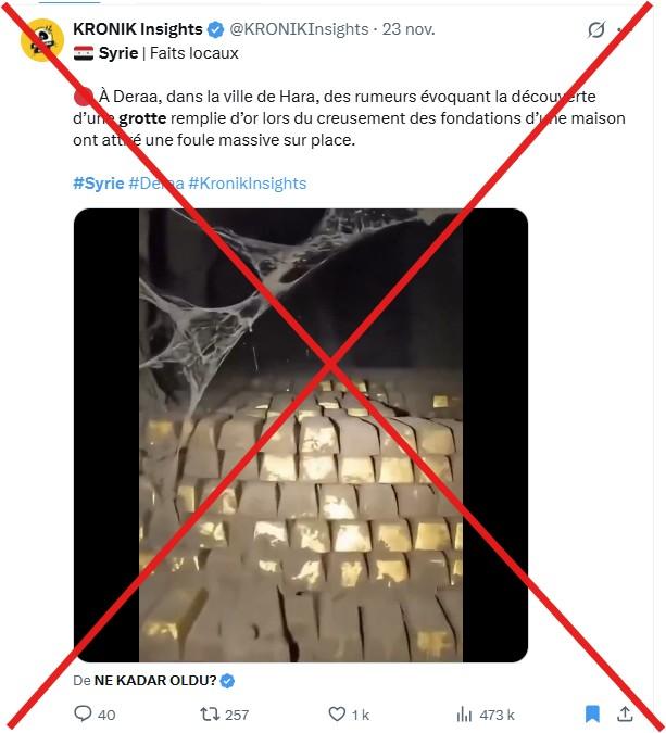 "À Deraa, dans la ville de Hara, des rumeurs évoquant la découverte d'une grotte remplie d’or lors du creusement des fondations d’une maison ont attiré une foule massive sur place", affirme le compte X "KRONIK Insights", qui se dit "relais d'informations impartiales".