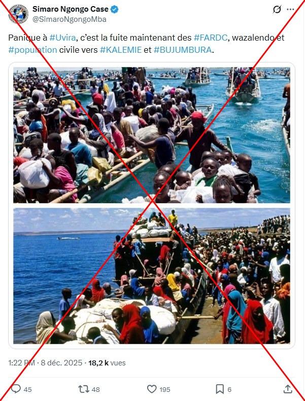 Dans l’est de la République démocratique du Congo (RDC), de récents affrontements dans la ville d’Uvira entre les forces congolaises et des éléments du groupe armé M23 ont contraint des dizaines de milliers d'habitants à se déplacer en masse vers le Burundi voisin pour fuir les violences. Dans ce contexte, deux images d'embarcations surchargées de personnes sont largement partagées sur les réseaux sociaux. Les utilisateurs prétendent qu'elles montreraient cet exode des civils vers le Burundi. Si la situation humanitaire demeure effectivement préoccupante dans cette partie de la RDC, ces images qui circulent ne sont pas authentiques : elles ont été générées par intelligence artificielle.