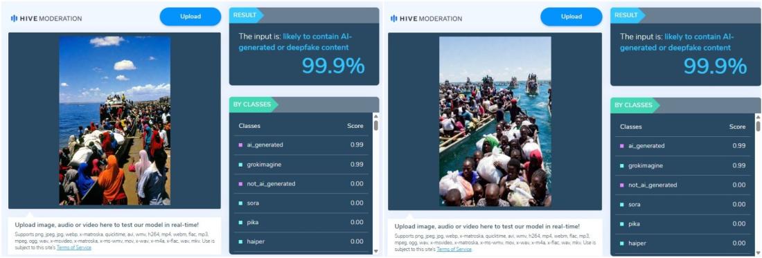 Une analyse menée sur le détecteur d’IA Hive Moderation indique que ces deux photos ont chacune 99,9 % de chances d'avoir été générée par Intelligence artificielle.