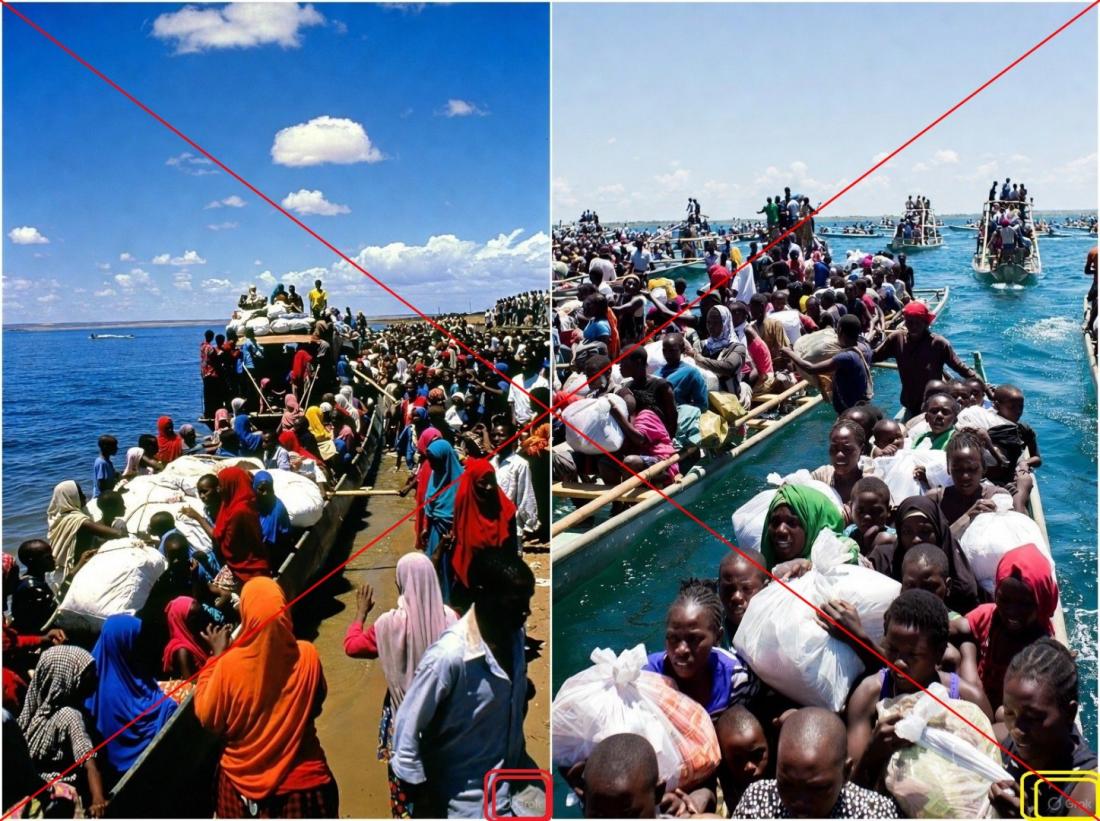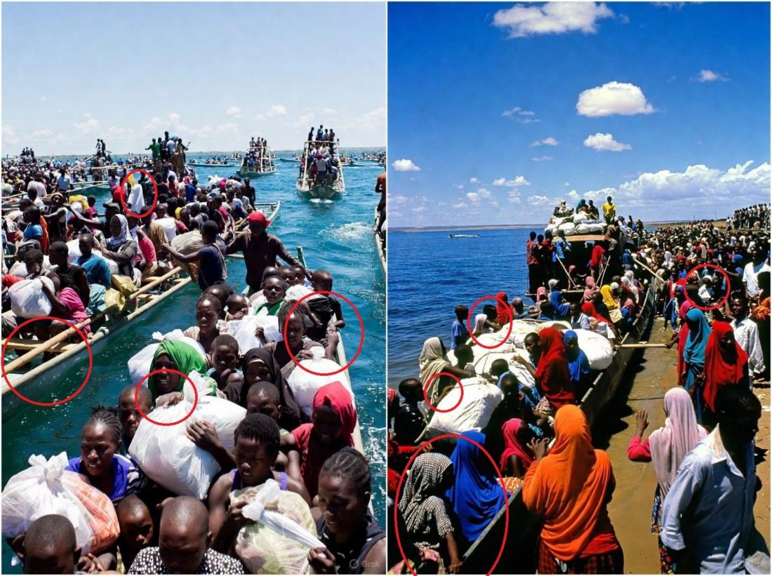 L’une montre une pirogue de grande taille, lourdement chargée, transportant de nombreux hommes, femmes et enfants serrés les uns contre les autres, avec leurs sacs et ballots. L’autre présente plusieurs embarcations de fortune, elles aussi bondées de passagers, voguant sur une vaste étendue d’eau.