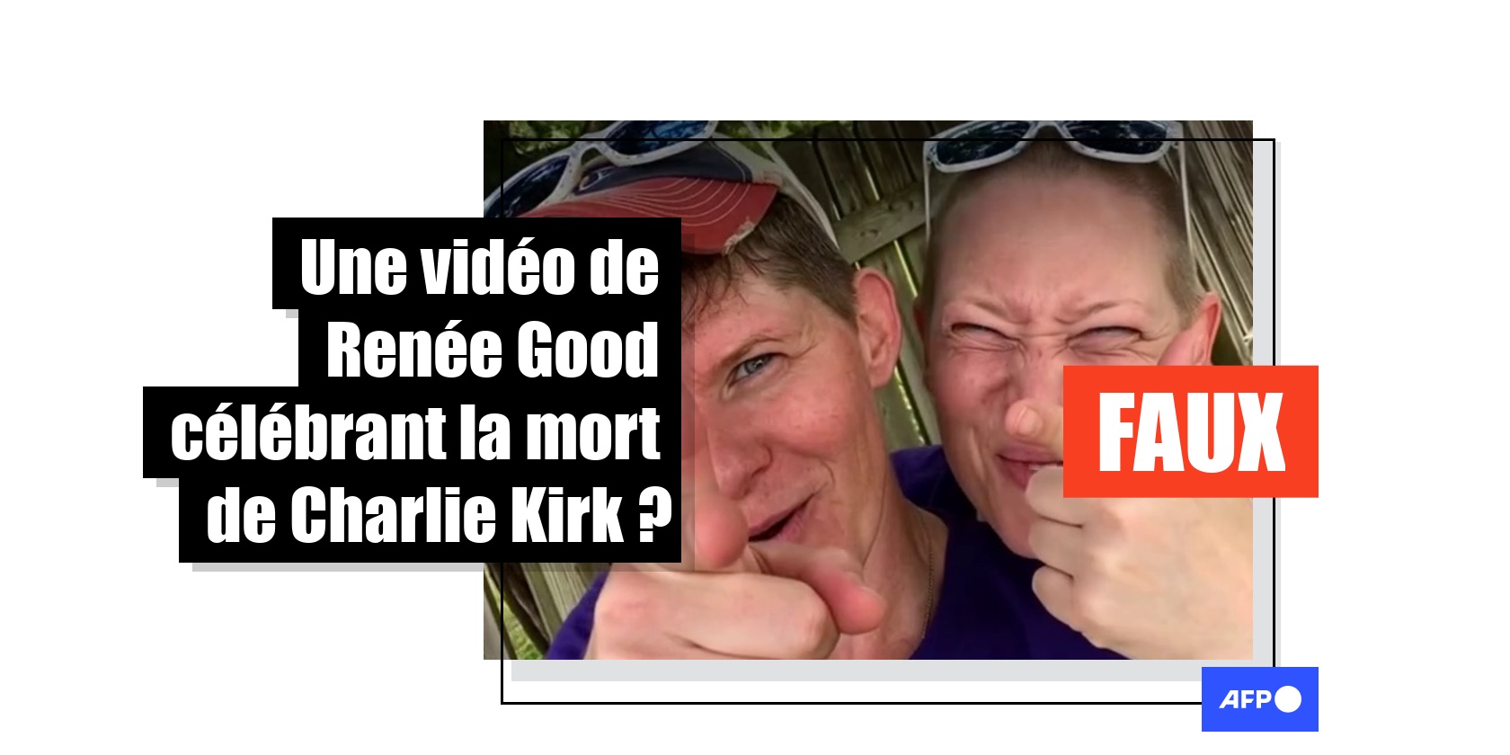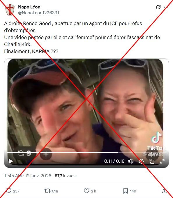"A droite Renee Good , abattue par un agent du ICE pour refus d'obtempérer. Une vidéo postée par elle et sa 'femme' pour célébrer l'assassinat de Charlie Kirk. Finalement, KARMA ???", peut-on lire dans une publication sur X, partagée au moins 900 fois et ayant recueilli plus de 3.000 "j'aime" depuis le 12 janvier.