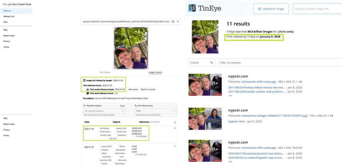 Si l'AFP n'a pas pas été en mesure d'identifier avec certitude le réseau social sur lequel la photo a été initialement mise en ligne, des outils de vérification tels que Google Fact Check Tools ou encore TinEye estiment que la première occurrence de cette photo se trouve dans les médias au lendemain de la mort de Renée Good. Ces premiers résultats renvoient systématiquement vers cet article du New York Post, daté du 8 janvier 2026 (liens archivés ici et ici).