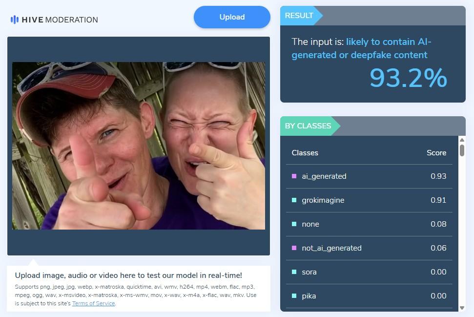 Une analyse de l'image effectuée par l'AFP à l'aide du détecteur de deepfakes sur Hive Moderation indique qu'elle est "susceptible de contenir du contenu généré par IA" à 93.2 %.