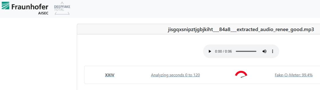 Enfin, une analyse audio de la vidéo virale, réalisée à l'aide du détecteur de deepfakes Deepfake Total, estime que l'audio a été très probablement générée par IA, avec un score de 99.4 % (lien archivé ici).