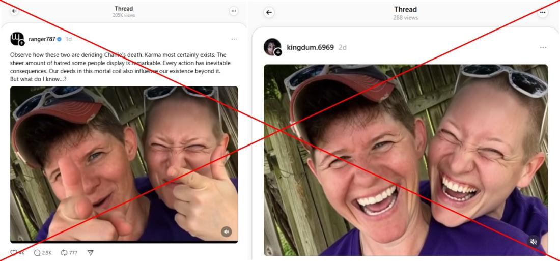 La vidéo a ensuite été reprise le même jour, toujours sur Threads, par un internaute affirmant en anglais : "Regardez comme ces deux-là se moquent de la mort de Charlie [Kirk]. Le karma existe bel et bien. La quantité de haine que certaines personnes affichent est stupéfiante. Chaque action entraîne inévitablement des conséquences. Nos actes dans cette vallée de larmes influencent aussi notre existence au-delà. Mais qu'est-ce que j'en sais… ?".