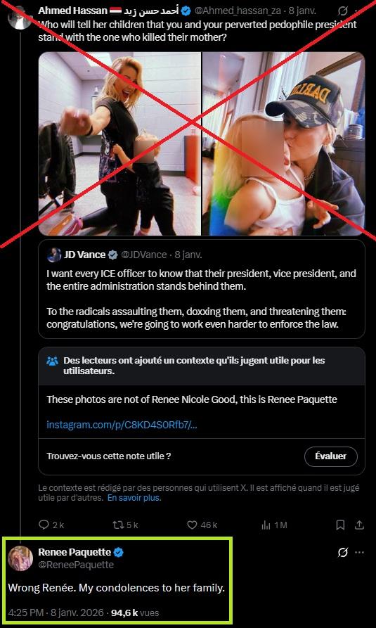 Renee Paquette a d'ailleurs réagi directement sous l'une des publications erronées en anglais, afin de rétablir les faits : "Mauvaise Renee. Mes condoléances à sa famille", a-t-elle écrit sur X le 8 janvier (lien archivé ici).
