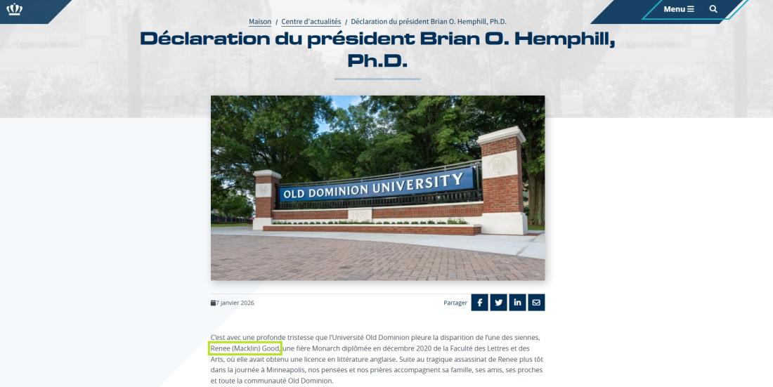 Dans un communiqué daté du 7 janvier 2026, le président de l'université Old Dominion a déclaré que Renée Good - qu'il désigne comme "Renee (Macklin) Good" - a obtenu, en décembre 2020, un diplôme en anglais (lien archivé ici).