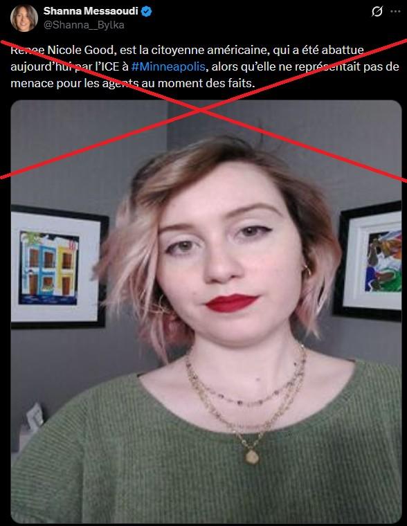 "Renee Nicole Good est la citoyenne américaine qui a été abattue aujourd'hui par l'ICE à #Minneapolis, alors qu'elle ne représentait pas de menace pour les agents au moment des faits", peut-on lire dans une publication X, partagée des centaines de fois depuis le 7 janvier. Le message est accompagné de la photo d'une femme aux cheveux courts teints en rose, portant du rouge à lèvres et un pull vert olive.