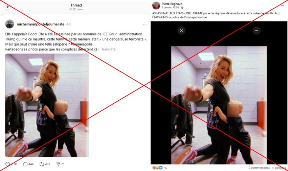 "Elle s'appelait Good. Elle a été assassinée par les hommes de ICE. Pour l'administration Trump qui nie ce meurtre, cette femme, cette maman, était 'une dangereuse terroriste'. Mais qui peut croire une telle saloperie ? #minneapolis Partageons sa photo parce que les complices détestent ça !", affirme notamment un internaute sur Facebook, dans une publication partagée des centaines de fois depuis le 9 janvier.