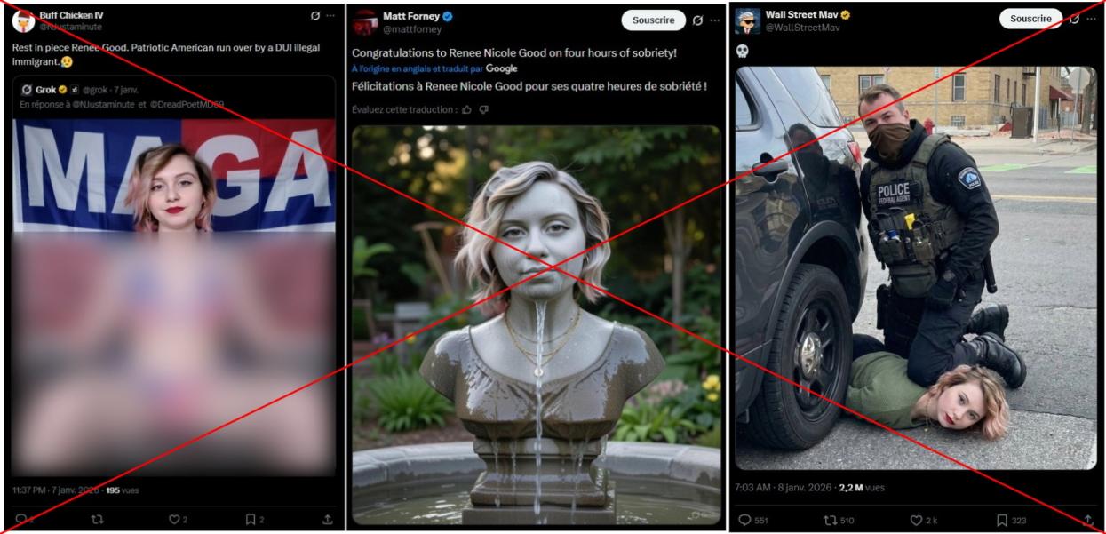 D'autre part, des internautes anglophones favorables à l'intervention de l'agent de l'ICE ont détourné cette image dans des mèmes moqueurs ou ont eu recours à l'intelligence artificielle (IA) pour générer de nouvelles représentations, comme l'a vérifié l'AFP. Selon des experts contactés par l'AFP, ces créations contribuent à la déshumanisation et à la sexualisation de la victime (lien archivé ici).