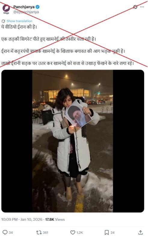 La légende en hindi d'une des publications indique que "cette vidéo provient d'Iran. Une jeune fille brûle un portrait de Khamenei tout en fumant une cigarette. Le feu de la rébellion contre le dirigeant autoritaire iranien est allumé".