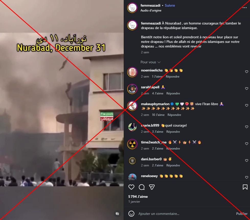 Une autre vidéo affirmant qu'"à Nourabad, un homme courageux fait tomber le drapeau de la république islamique" a été diffusée sur Instagram le 1er janvier, avant d'être relayée des centaines de fois et de cumuler plus de 92.000 vues. On y voit un homme retirer un drapeau du sommet d'un bâtiment, tandis qu'un groupe de personnes l'observent et crient depuis la rue.