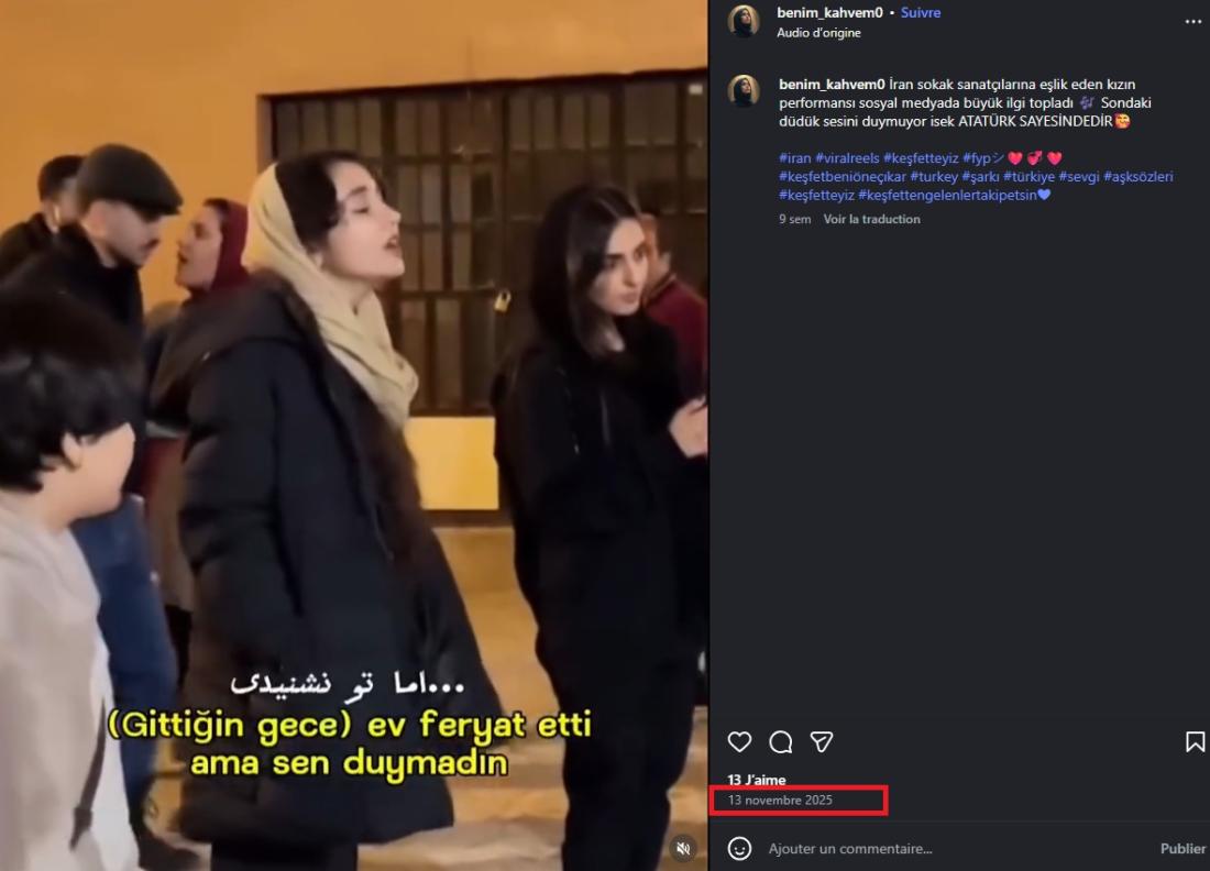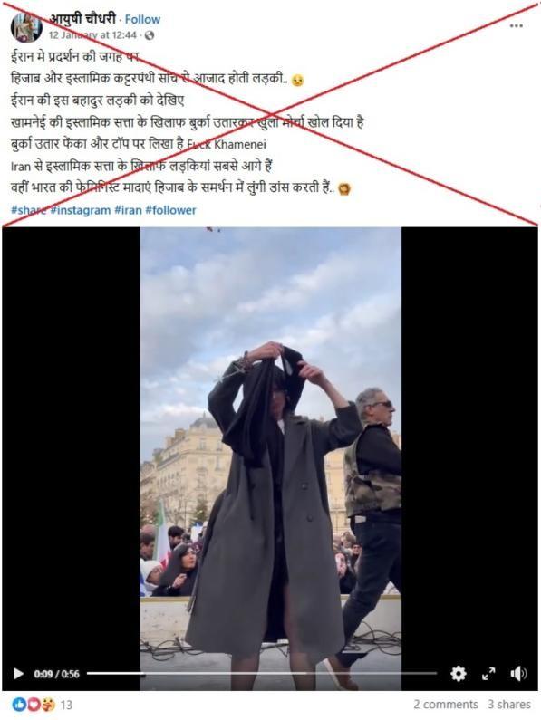 Autre exemple: "Une jeune fille en Iran se libère du hijab et du fondamentalisme islamique lors d'une manifestation", peut-on lire dans la légende en hindi d'une vidéo Facebook partagée le 12 janvier 2026.