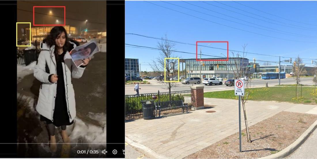 Les éléments d'arrière-plan de la vidéo qui circule correspondent à un parking à Richmond Hill, dans la banlieue de Toronto, au Canada, comme repéré par le site de fact-checking Lusa (lien archivé ici), et comme le confirment les images de Google Street View de la ville (lien archivé ici).