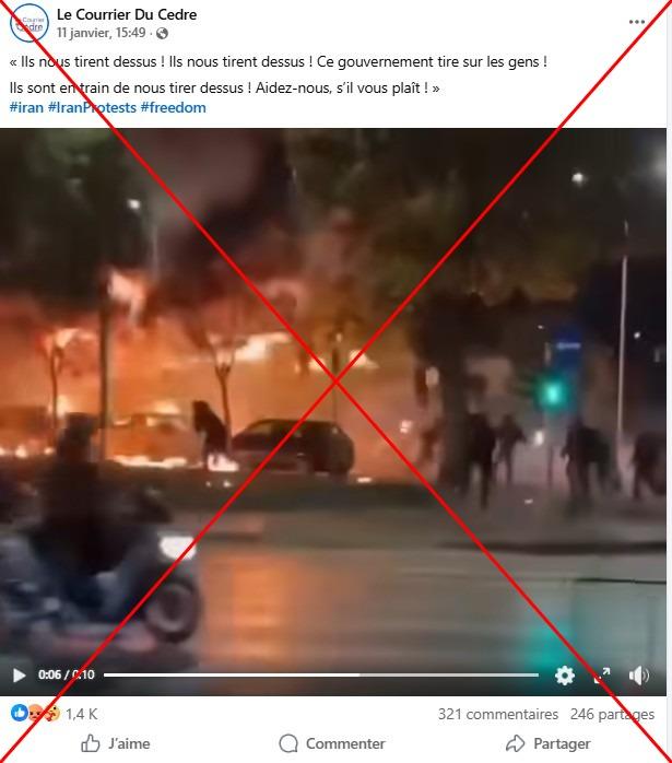 Parmi les images douteuses examinées par l'AFP, figure une vidéo montrant des voitures encerclées par des flammes pendant que des individus lancent des cocktails Molotov, partagée dans une publication Facebook en français, le 11 janvier 2026.