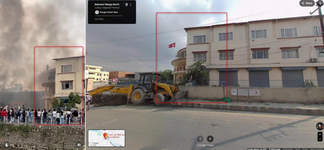 Une recherche par mots-clés, incluant le nom du parti communiste népalais mentionné dans les publications, a permis à l'AFP de géolocaliser la scène à l'aide de Google Street View (lien archivé ici). Plusieurs éléments concordants sont visibles : l'enseigne rouge "CPM UML", ainsi que le bâtiment jaune du siège du parti, situé à Katmandou, la capitale du Népal.