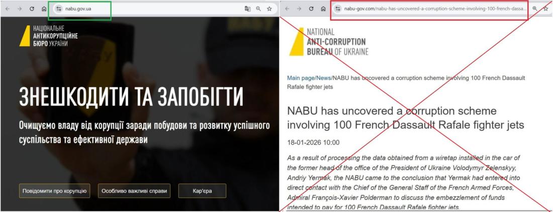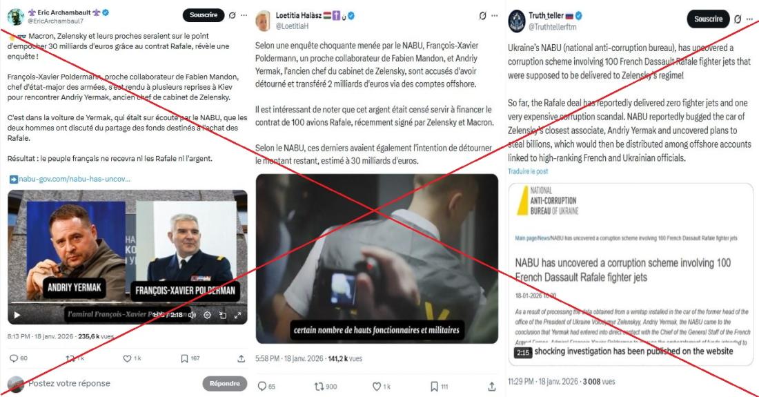 Le 18 janvier 2026, une vidéo de deux minutes en français est mise en ligne de manière apparemment coordonnée, à quelques heures d'intervalle, par plusieurs comptes sur les réseaux sociaux. Celles-ci sont rapidement reprises, accompagnées de publications prétendant relayer une "révélation choquante" : "De hauts responsables et des militaires ukrainiens et français ont détourné 2 milliards d'euros destinés à l'achat de 100 avions de chasse Rafale", affirme l'une d'entre elles, publiée sur X par un relais régulier de la désinformation prorusse, qui prétend s'appuyer sur une "enquête" du Bureau national anticorruption d'Ukraine (Nabu) (lien archivé ici).