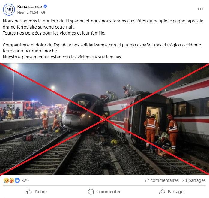 "Nous partageons la douleur de l'Espagne et nous nous tenons aux côtés du peuple espagnol après le drame ferroviaire survenu cette nuit. Toutes nos pensées pour les victimes et leur famille", peut-on par exemple lire, en français et en espagnol, dans une publication du parti Renaissance sur Facebook datée du 19 janvier (lien archivé ici).