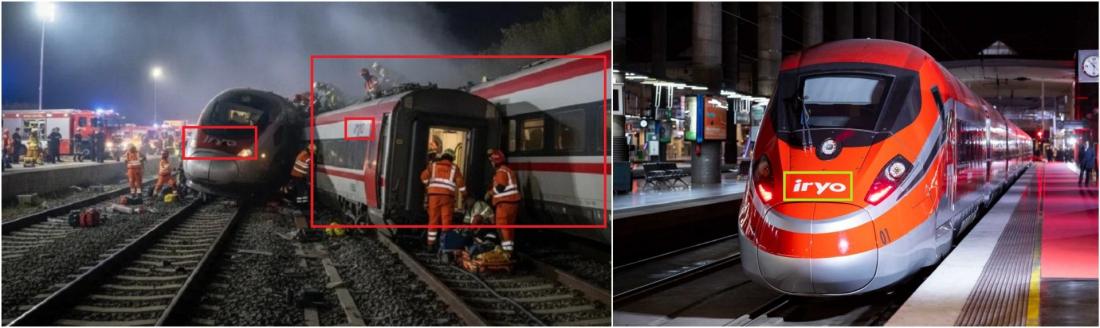 Tout d'abord, bien que le train dans l'image que nous vérifions soit censé appartenir à Iryo, les wagons sont blancs et arborent un rouge différent de celui utilisé par l'entreprise d'origine italienne, dont l'identité visuelle inclut également un gris métallisé. De plus, le nom "iryo" apparaît déformé sur les wagons.