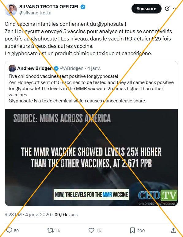 "Cinq vaccins infantiles contiennent du glyphosate", affirme sur X Silvano Trotta, figure vaccinosceptique et complotiste francophone, le 4 janvier 2026. "Les niveaux dans le vaccin ROR [Rougeole, oreillons, rubéole] étaient 25 supérieurs à ceux des autres vaccins" analysés, ajoute l’entrepreneur strasbourgeois, reprenant des affirmations relayées depuis près de dix ans.