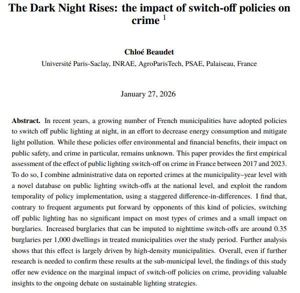 Le lien éclairage public/insécurité "était, et c'est encore le cas, difficilement étudiable en France du fait de la [faible, NDLR] disponibilité des données", a expliqué à l'AFP le 27 janvier 2026 Chloé Beaudet, docteure en économie de l'environnement à l'Université Paris-Saclay et autrice de la seule étude française sur l'extinction de l'éclairage la nuit (lien archivé ici).