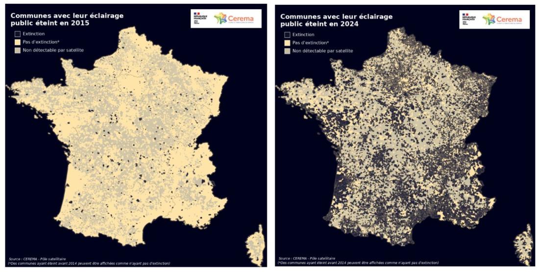L'extinction nocturne de l'éclairage public a très nettement progressé en France entre 2014 et 2024, notamment avec la crise énergétique à l'hiver 2022-2023, selon une récente étude du Centre d'études et d'expertise sur les risques, l'environnement, la mobilité et l'aménagement (Cerema) réalisée à partir de données satellitaires (lien archivé ici). Outre une facture d'électricité allégée, la mesure permet de réduire nettement la pollution lumineuse, qui perturbe le comportement des animaux et s'avère néfaste pour la santé humaine, comme cela est désormais scientifiquement établi (liens archivés ici et ici).