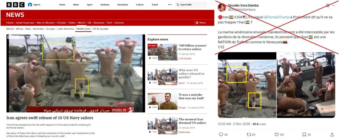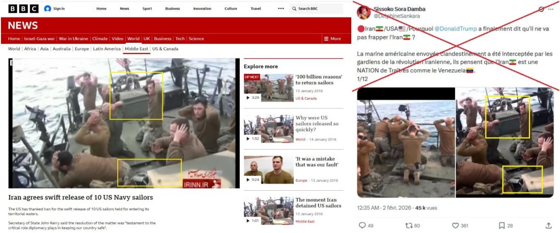 Depuis janvier, les relations diplomatiques entre l'Iran et les Etats-Unis se sont encore tendues. Face aux menaces d'intervention militaire américaine et à une décision inédite de l'UE contre les Gardiens de la Révolution, Téhéran s'est dit prêt à une "riposte écrasante". Des discussions diplomatiques doivent se tenir à la fin de la semaine en vue de négociations entre les deux puissances. Dans ce contexte, une rumeur laisse entendre sur les réseaux sociaux que des soldats de la marine américaine auraient été récemment "interceptés" par l'Iran, images à l'appui. Mais ces visuels sont en réalité extraits d'une vidéo filmée il y a plus de dix ans, lorsque dix militaires américains avaient été brièvement détenus par les autorités iraniennes en 2016. Ils étaient accusés d'avoir navigué sans autorisation dans les eaux territoriales de Téhéran.