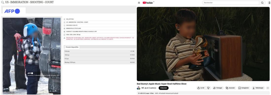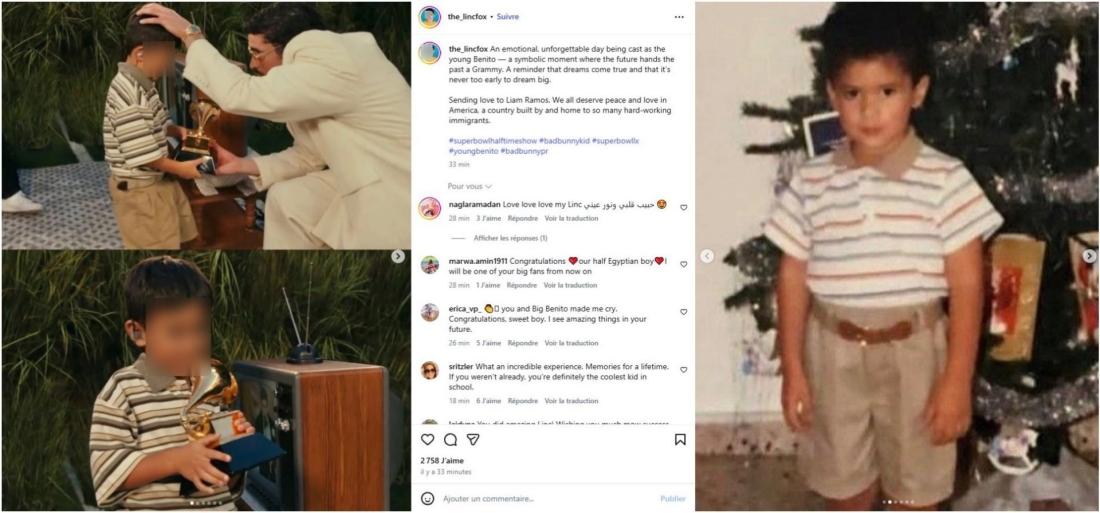 La publication est illustrée par une première image montrant une capture d'écran de la diffusion en direct du Super Bowl (entre les minutes 9:06 et 9:17), où apparaît l'enfant avec Bad Bunny (lien archivé ici). Une seconde image montre ce qui semble être une photographie de Bad Bunny enfant, vêtu de manière similaire à Lincoln Fox, renforçant la symbolique de la scène - la transmission entre le passé et le futur de l'artiste (lien archivé ici).