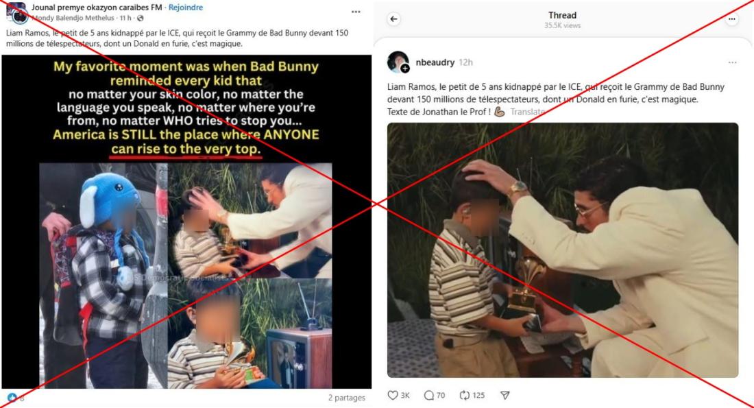 "Liam Ramos, le petit de 5 ans kidnappé par le ICE, qui reçoit le Grammy de Bad Bunny devant 150 millions de télespectateurs, dont un Donald en furie, c'est magique", affirme un internaute sur Threads, dans une publication partagée une centaine de fois depuis le 9 février, et aimée par près de 4.000 internautes.
