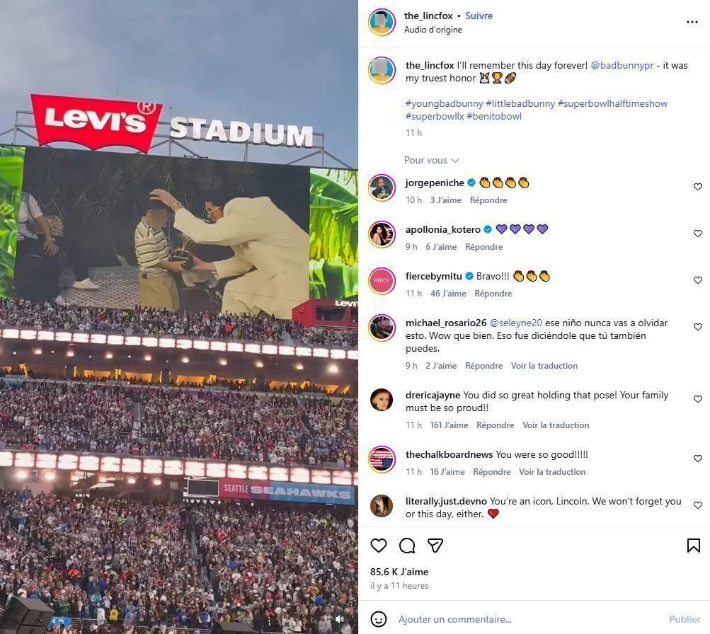 Quelques heures après le spectacle, le compte au nom de Lincoln Fox a publié une vidéo sur Instagram dans laquelle il affirme : "Je me souviendrai de ce jour pour toujours ! @badbunnypr - ce fut mon plus grand honneur", accompagnant son message des hashtags #youngbadbunny ("jeunebadbunny") ou #littlebadbunny ("petitbadbunny") (lien archivé ici).