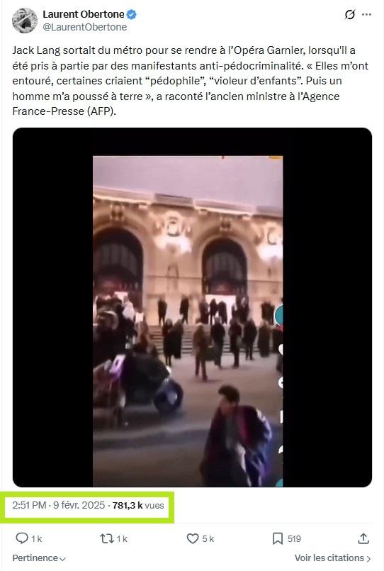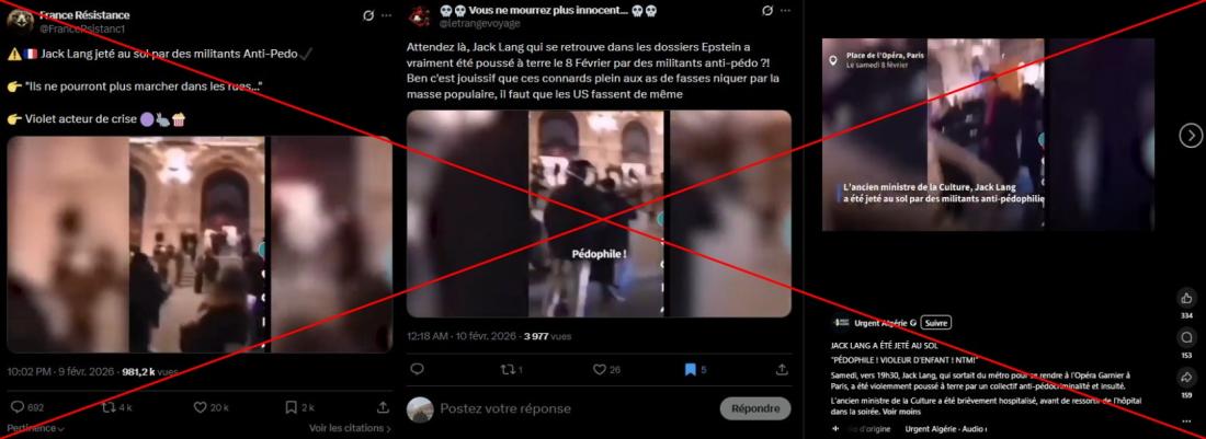 "Jack Lang jeté au sol par des militants Anti-Pedo", peut-on lire en légende d'une vidéo partagée des milliers de fois sur X, Facebook et TikTok. Sur ce clip de mauvaise qualité d'une durée d'une minute et dix secondes, on aperçoit le directeur de l'Institut du monde arabe Jack Lang, revêtu de l'écharpe violette qu'il porte régulièrement en public, traverser un petit attroupement pour se rendre à l'Opéra Garnier, à Paris. On entend des huées, puis une silhouette se précipite et le pousse dans le dos, le faisant chuter au sol alors que les injures fusent, une manifestante traitant l'octogénaire de "pédophile".