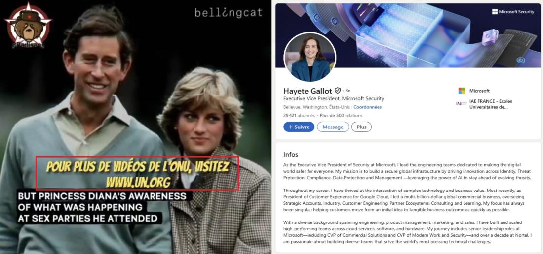 Hayete Gallot, citée dans l'une des vidéos, occupe par exemple bel et bien des fonctions de direction à la sécurité de Microsoft : mais on ne retrouve nulle part la trace de la citation qui lui est attribuée, la photo qui illustre sa prétendue intervention provient de son compte LinkedIn, disponible publiquement, et son nom est parfois écorché dans les sous-titres ("Béate Gallaud") (lien archivé ici).