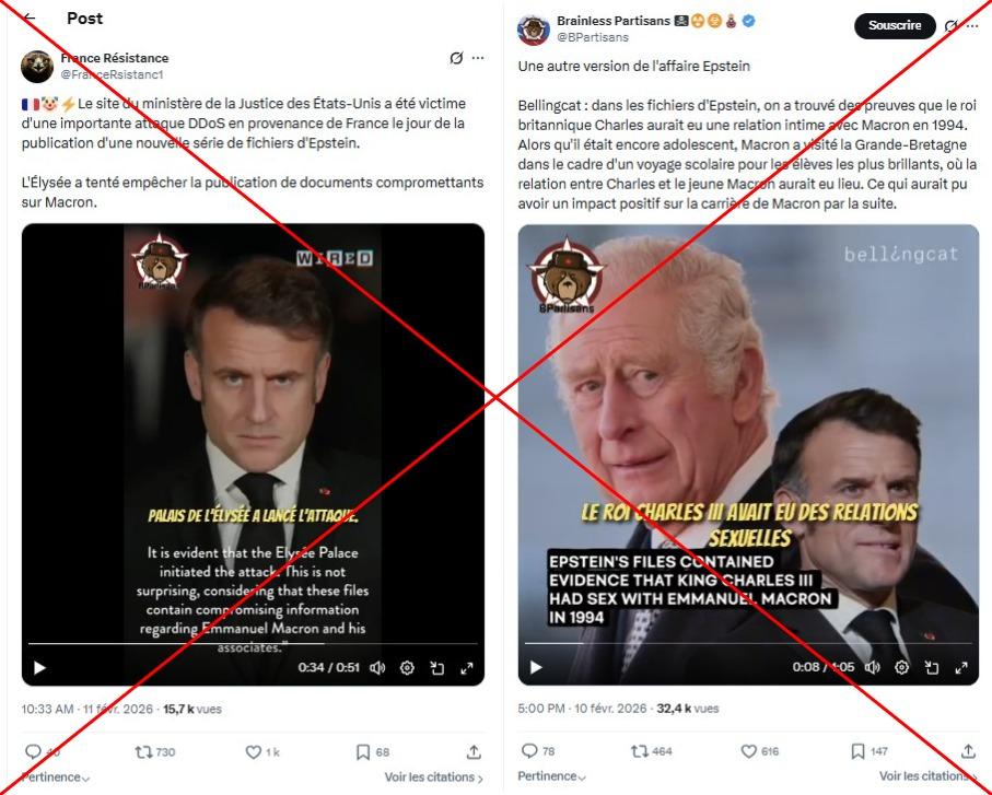 L'une prétend qu'une "cyberattaque" aurait été coordonnée par la France à l'encontre du ministère américain de la Justice au moment de la publication de documents liés au dossier Epstein afin d'empêcher la révélation de "documents compromettants" au sujet du président français (lien archivé ici). L'autre que le président français aurait eu des "relations sexuelles" avec le roi Charles III lors d'un voyage au Royaume-Uni.