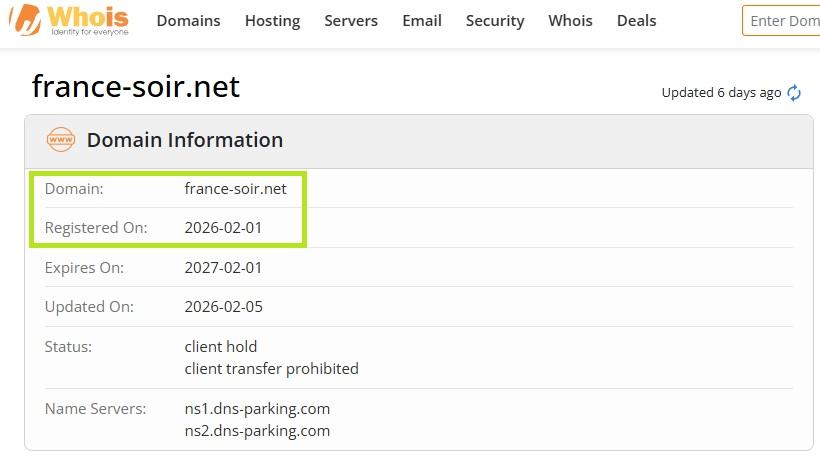 Une recherche effectuée sur Whois, qui permet d'obtenir des informations sur les noms de domaine de sites internet, révèle que ce site a été créé le 1er février 2026, soit quelques jours seulement avant la publication de l'article ; une autre caractéristique des opérations russes en ligne (lien archivé ici).