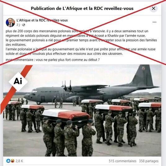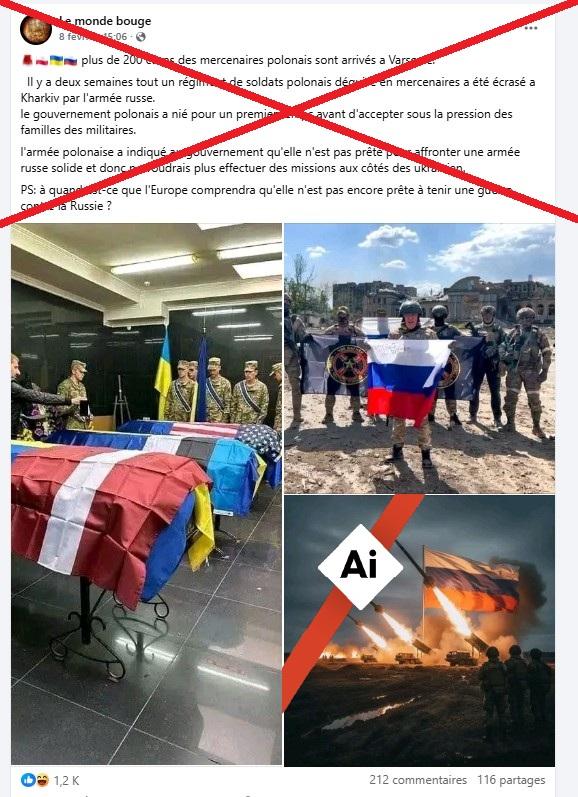 Depuis le début de la guerre en Ukraine, des campagnes de désinformation prorusses accompagnent les combats sur le terrain. Récemment, des dizaines de publications censées montrer les corps de 200 mercenaires polonais morts pour défendre l'Ukraine ont inondé les réseaux sociaux. Mais attention, les images relayées par ces publications sont fausses : certaines ont été générées par intelligence artificielle (IA) et d’autres sont beaucoup plus anciennes et ne montrent pas des soldats polonais. Car sur le fond, l’armée polonaise n’a pas envoyé de soldats combattre en Ukraine.