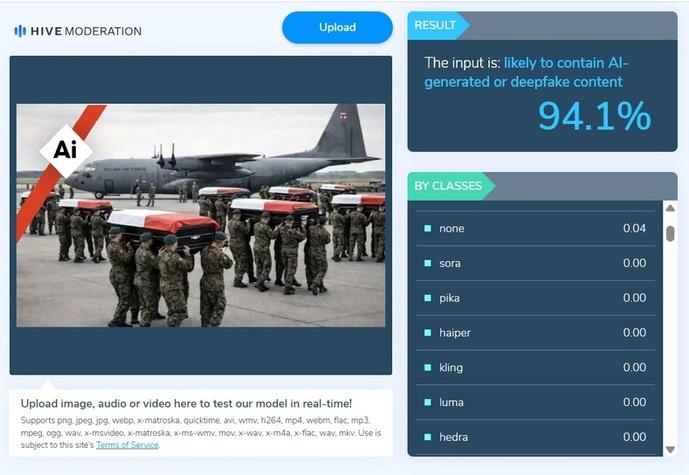 Pour autant, elle pas réelle et a été générée par une IA, comme le prouvent plusieurs incohérences visuelles (drapeau démesuré, missiles visiblement plus gros que les lanceurs, etc.) et une texture trop lisse de l'image. Une analyse lancée sur le logiciel de détection d’IA Hive moderation confirme que cette image a plus de 98% de chance d'avoir été générée par cette technologie.