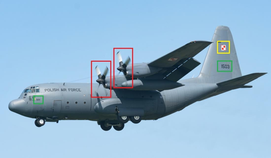 Des incohérences visuelles sont aussi visibles sur cet avion : par exemple, les pales des deux hélices sont à moitié coupées et semblent rattachées à un seul et même moteur. Il n'y a pas de numéro d’identification visible sur le fuselage, or ces numéros sont normalement présents sur les avions militaires. Le drapeau sur la queue de l’aéronef ne correspond pas non plus aux marquages visibles sur les avions de ce type dans l'armée de l'air polonaise.