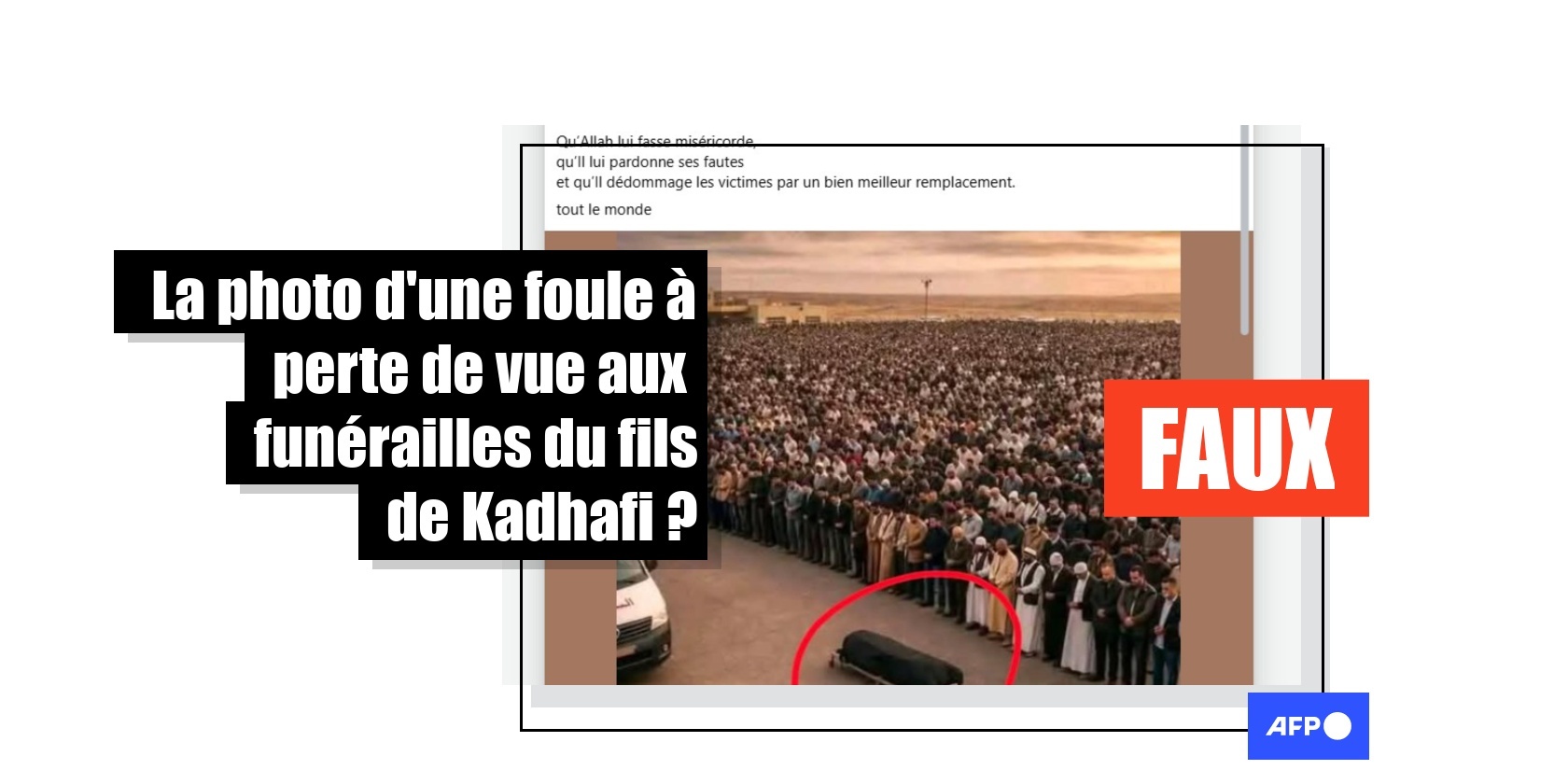 "Un monde fou au funérailles de SAÏF AL-ISLAM KADHAFI (...) Ce qui aurait dû être une simple inhumation s’est transformé en un référendum populaire", ajoute cette page guinéenne. Certaines publications vont même jusqu’à brandir cette photo pour affirmer que ces funérailles auraient mobilisé plus d’un million de personnes (1, 2, 3).