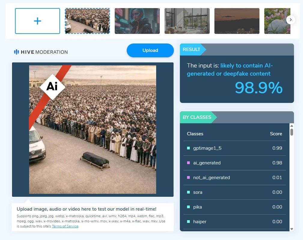 En passant cette image virale dans un outil de détection d’images générées par IA, comme le logiciel Hive Moderation, les résultats nous confirment qu'elle a 99% de chance d’avoir été générée à l’aide de cette technologie.