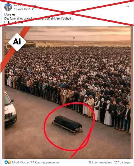 Plusieurs publications sur Facebook et X (1, 2) l’utilisent pour souligner le caractère exceptionnel de la mobilisation. "Libye : Des funérailles grandioses pour Saïf al-Islam Kadhafi…", affirme ainsi ce post qui cumule plus de 3.800 mentions "j’aime" depuis sa publication le 7 février 2026.