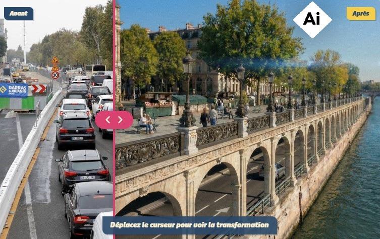 A Paris, l'eurodéputée d'extrême droite Sarah Knafo, candidate Reconquête! à la mairie, propose de rouvrir les voies sur berges aux voitures au coeur de Paris, et de construire au-dessus une promenade piétonne, sur 2 kilomètres, pour un coût total de 60 millions d'euros (lien archivé ici). "La couverture et la promenade seront construites avec une structure très simple. Un portique appuyé sur une ligne d'arches côté Seine et sur le mur de quai existant côté rue" - des travaux "relativement légers", précédés d'une "étude d'impact approfondie", puis validés par "référendum" auprès des Parisiens, indique le site de sa campagne, image générée par intelligence artificielle à l'appui (lien archivé ici).