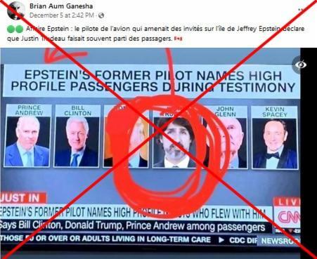 "Affaire Epstein : le pilote de l'avion qui amenait des invités sur l'île de Jeffrey Epstein déclare que Justin Trudeau faisait souvent parti des passagers", affirme une publication sur Facebook datée du 5 décembre. Celle-ci partage une supposée image d'illustration de la chaîne américaine CNN montrant le Premier ministre canadien parmi d'autres célébrités citées comme ayant voyagé à bord de l'avion d'Epstein.