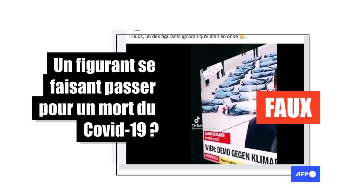 "Les miracles de la pandémie", ironise un internaute, "Oups, un des figurants a oublié qu'il était [en direct]", abonde une autre. La vidéo est visiblement une publication sur TikTok, montrant un extrait de reportage, avec un homme parlant allemand et des personnes paraissant être dans des sacs mortuaires sont allongées derrière. L'une d'entre elles bouge et fait mine de se relever.