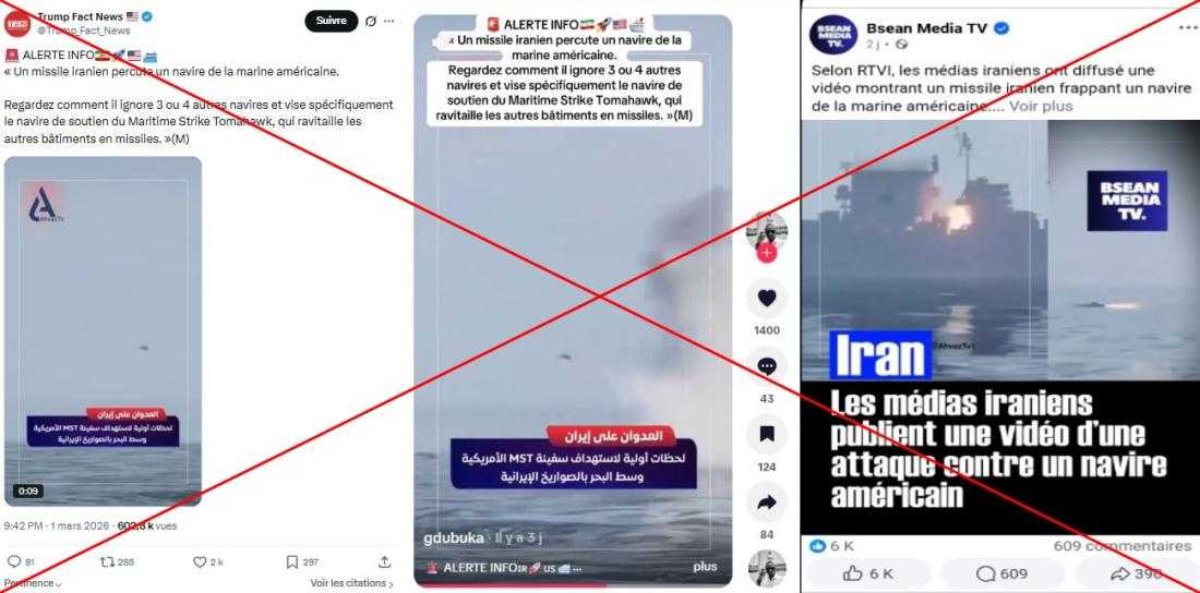 "Les médias iraniens ont publié une vidéo du naufrage d'un navire de la marine américaine par une missile iranien [sic]", peut-on lire en légende d'une vidéo partagée le 2 mars sur Facebook, d'après laquelle "Il est rapporté qu'il s'agit d'un navire équipé de missiles Maritime Strike Tomahawk".