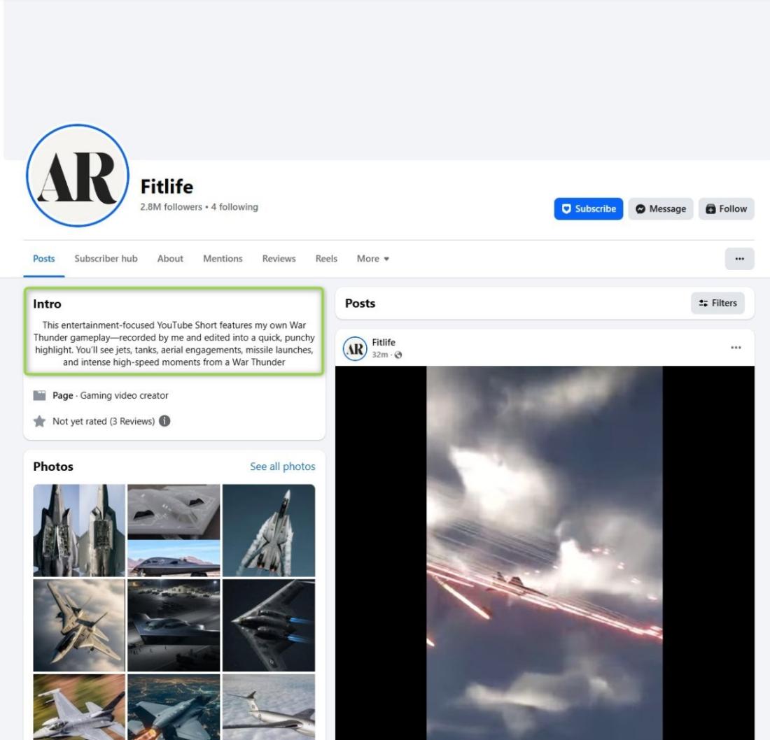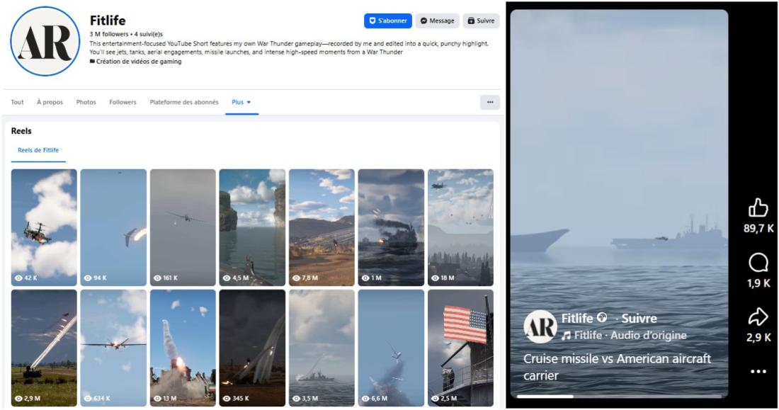 Dans la bio de ce compte, l'utilisateur a indiqué que sa page est "axée sur le divertissement" et présente des extraits du jeu vidéo de simulation militaire War Thunder, enregistrés et montés par ses soins (lien archivé ici).