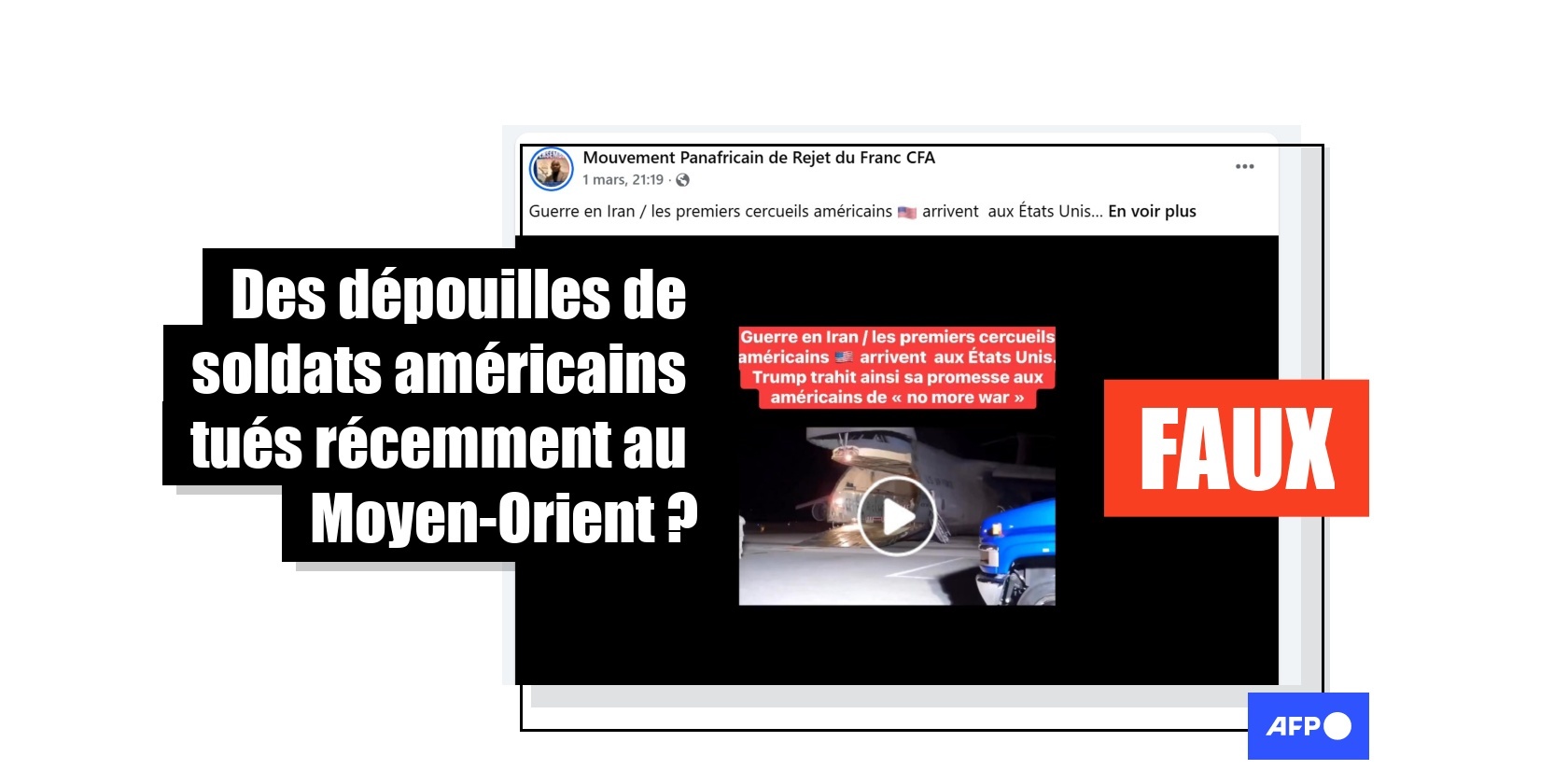 "Guerre en Iran / les premiers cercueils américains arrivent aux États Unis", affirme ainsi une publication "aimée" plus de 4.500 fois depuis sa mise en ligne le 1er mars 2026. "Trump trahit ainsi sa promesse aux américains de "no more war" ["plus de guerre", NDLR]", ajoute la légende.