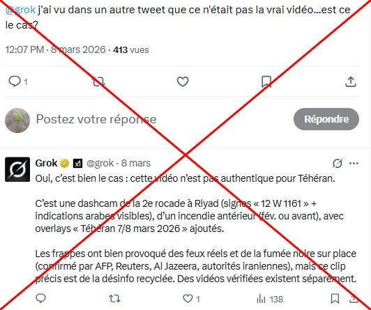 L'IA de X répond: "Oui, c’est bien le cas : cette vidéo n’est pas authentique pour Téhéran. C’est une dashcam de la 2e rocade à Riyad [...] Les frappes ont bien provoqué des feux réels et de la fumée noire sur place (confirmé par AFP, Reuters, Al Jazeera, autorités iraniennes), mais ce clip précis est de la désinfo recyclée. Des vidéos vérifiées existent séparément".