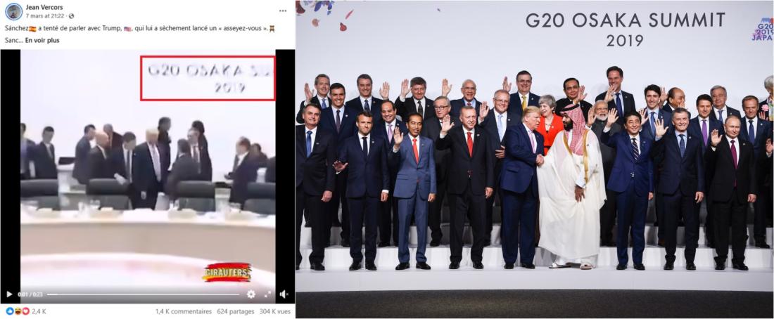 En comparant le logo du sommet ("G20 OSAKA SUMMIT 2019") visible à l'arrière-plan de la vidéo virale avec celui des photographies officielles de l'événement, on constate qu'il s'agit du même décor.