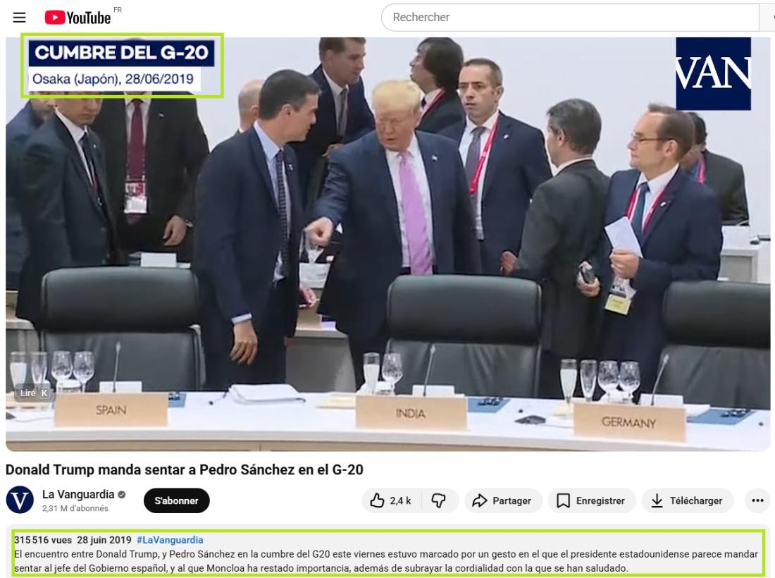 L'AFP a ainsi retrouvé plusieurs occurrences de la séquence virale sur YouTube (1, 2, 3), publiées dès le 28 juin 2019 : elles montrent cette courte interaction Donald Trump et Pedro Sánchez (liens archivés ici, ici et ici). L'une de ces vidéos a notamment été diffusée par le quotidien barcelonais La Vanguardia (lien archivé ici).