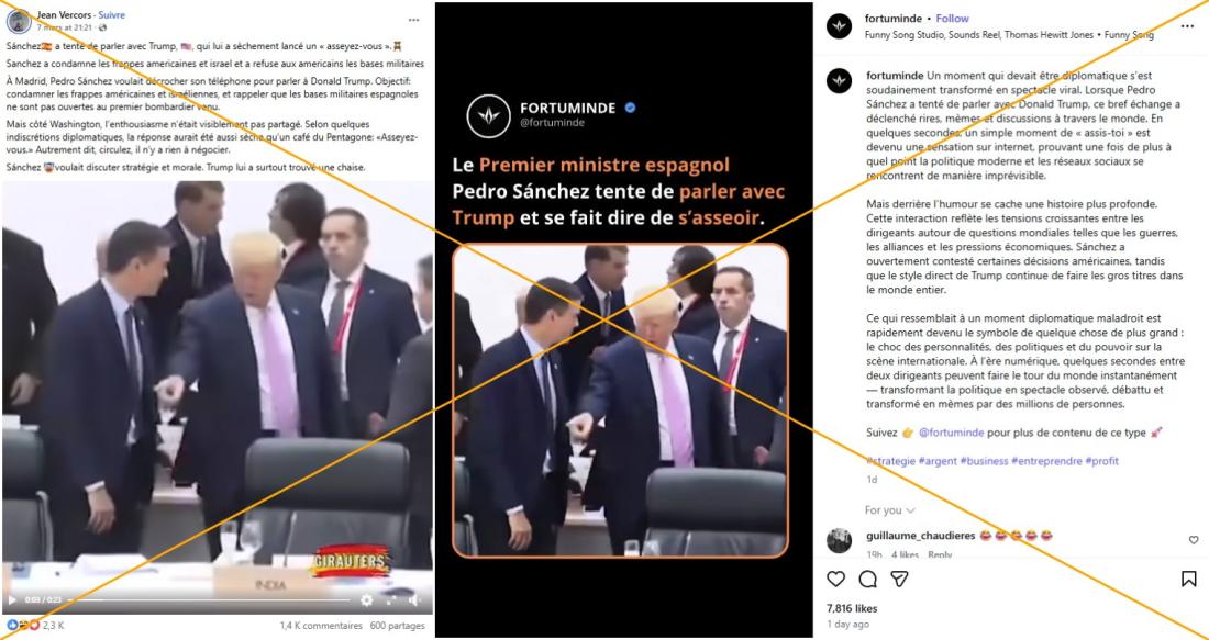 "Sánchez a tenté de parler avec Trump, qui lui a sèchement lancé un 'asseyez-vous'", peut-on lire dans une publication Facebook partagée plus de 600 fois et cumulant plus de 304.000 vues depuis le 7 mars.